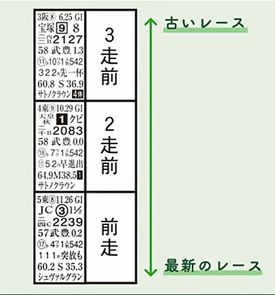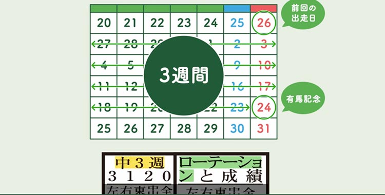 前回の出走から今回の出走までの期間が3週間だと「中3週」と呼ぶ。中3週の下の数字は、同じく過去に3週間、期間が空いて走った時の成績。左から1着・2着・3着。