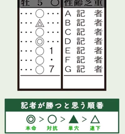 記者が一番自信を持って推している馬です。迷ったらまずはこの印がついている馬をチェックします。 - ○= 対抗(たいこう)