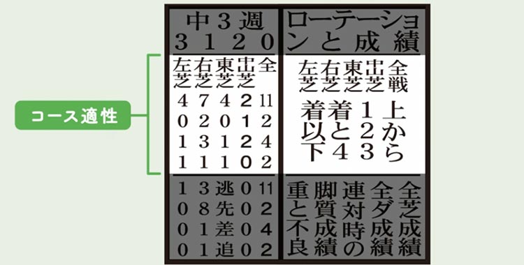 左から、左回り・右回り・東京競馬場・中山競馬場の芝コーズの成績が書かれている。「全」は全レースの成績。