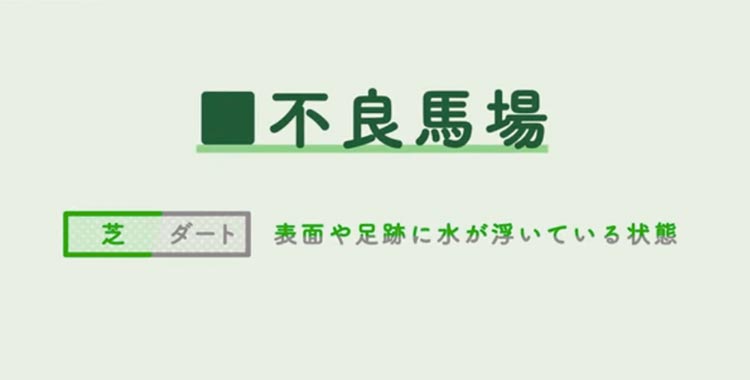 | 不良(ふりょう)/水たまり | 泥んこの最悪な状態。水しぶきや泥が飛び散る「田んぼ」のような状態。滑ったり、泥を被るのを嫌がる馬もいる。 ⇒ 実力馬でも負けるなど、波乱が起きやすい。 |